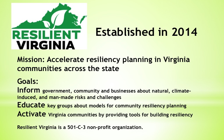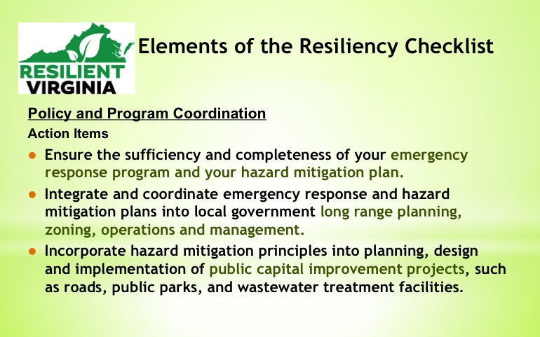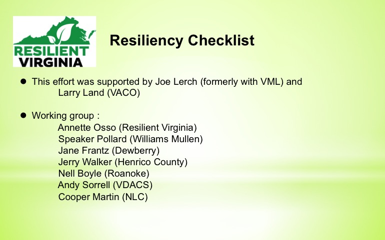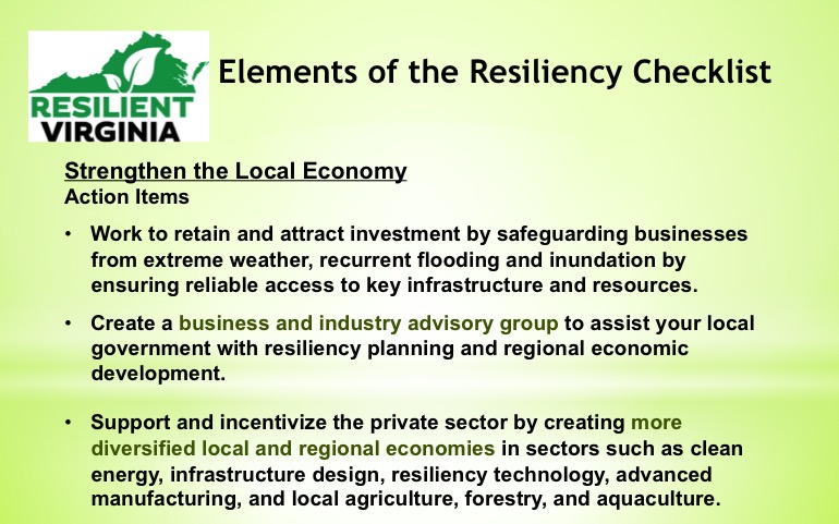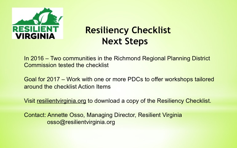 Resilient Virginia plans to work with Planning District Commissions to develop workshops around this guide to assist local governments in gaining the competency to move forward in resiliency planning. You can review an brief presentation on the Resiliency Checklist from the Resilient Virginia Conference here and the entire document here.