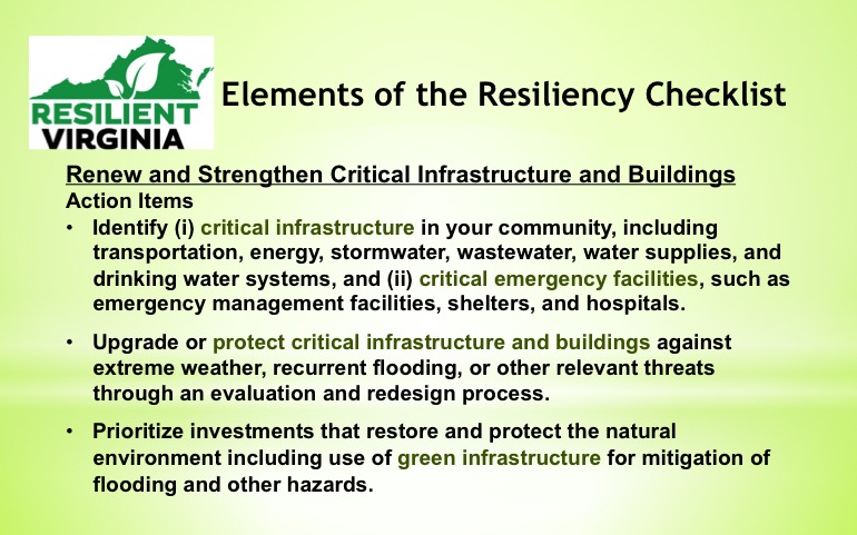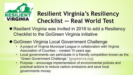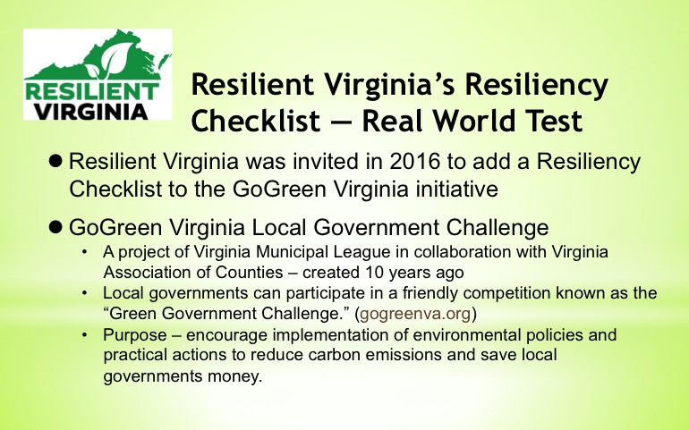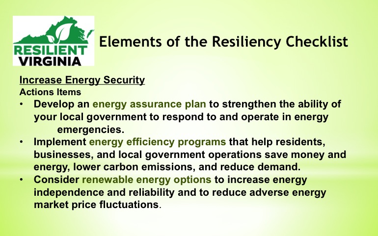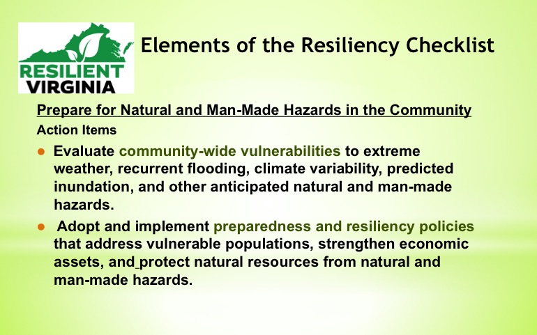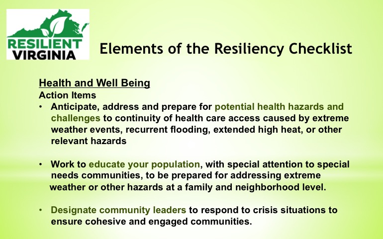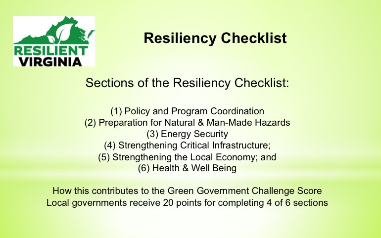 In collaboration with GoGreen Virginia, a Virginia Municipal League and Virginia Association of Counties program, Resilient Virginia is offering a guide to resiliency planning — the Resiliency Checklist. Formulated to add credits to the annual Green Government Challenge, the guide can also be utilized separately by local governments wanted a starting point to tackle comprehensive mitigation and adaptation approaches to disasters, climate extremes, and other risks faced by communities.