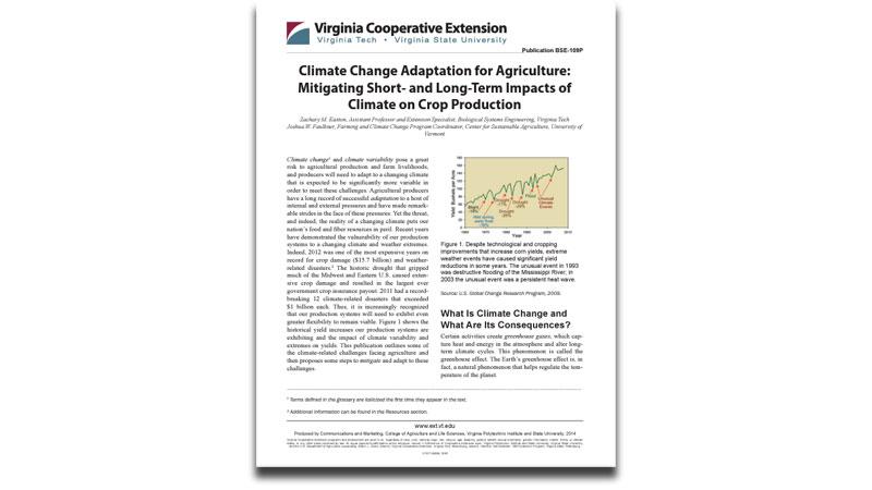 The Virginia Polytechnic Institute and Virginia State University produced this publication in 2014 outlining climate-related challenges facing agriculture and some options for mitigating and adapting to them.