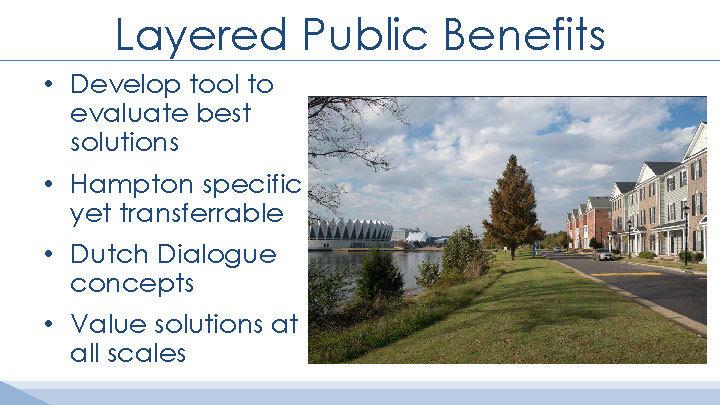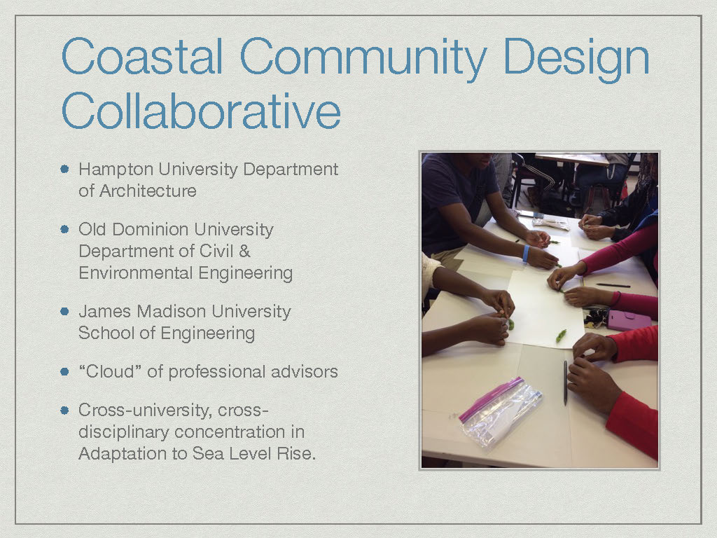 Coastal Focus Moderator: Jane Frantz, AICP, PMP, CFM, Deputy Branch Manager, Resilience Solutions Group, Dewberry Terry O’Neil, Director, Hampton Community Development Department: Hampton Plans for Living with Water Lewis Lawrence, Executive Director, MPPDC: Addressing Sea Level Rise in Rural Coastal Communities Mason Andrews, M. Arch., Associate Professor of Architecture, Hampton University: Resilient Neighborhood Design in Coastal Communities