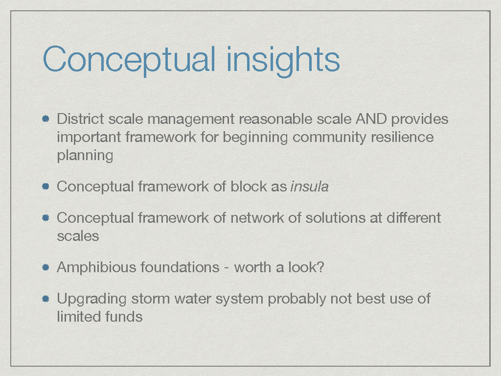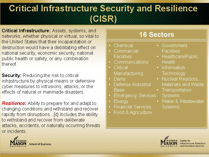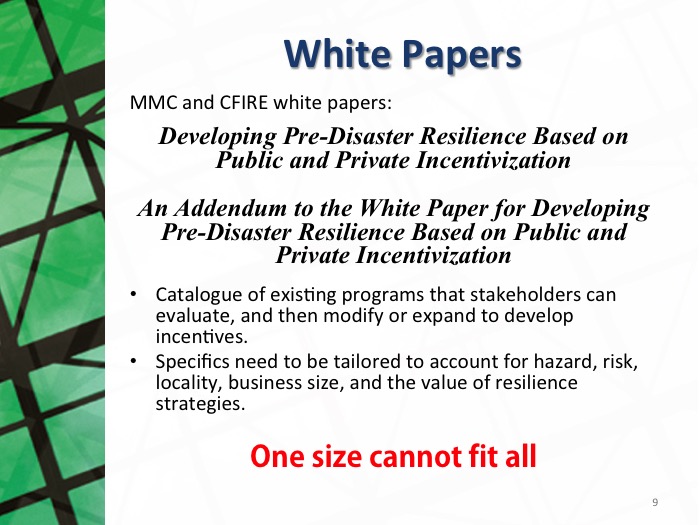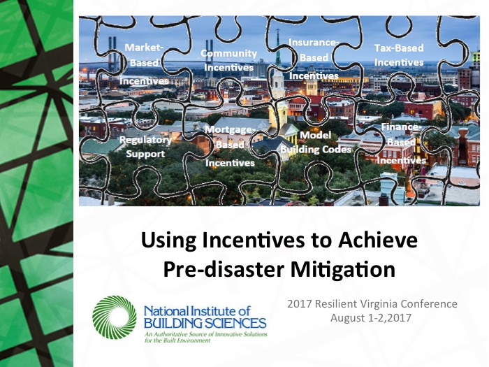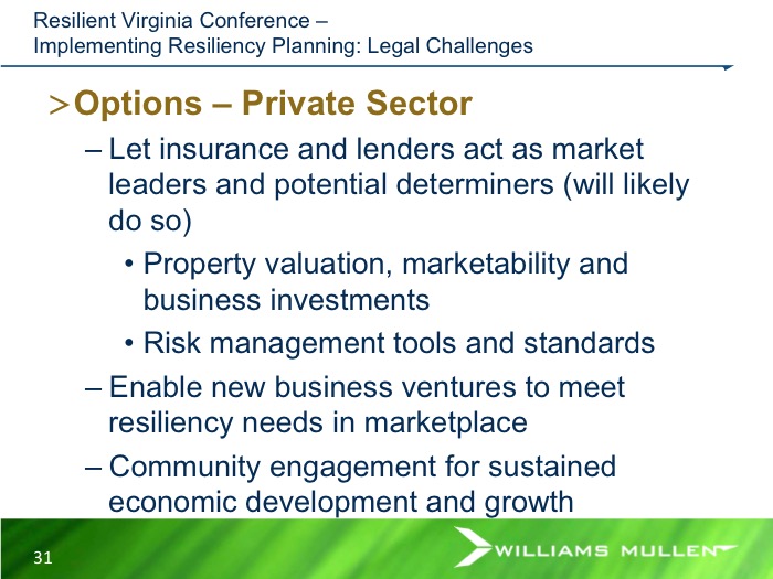 Infrastructure Adaptation Strategies Moderator: Ann Phillips, Rear Admiral USN (retired) Robert Mooney, Protective Security Advisor, Central VA, and Peter Owen, Protective Security Advisor, Norfolk: U.S. DHS: DHS Critical Infrastructure Programs Carol Considine, M.S., Associate Professor, Engineering Technology, Old Dominion University: Multi-sector Collaboration on Infrastructure Risks Stacie Neal, Critical Infrastructure Protection Program Manager for the Secretary of Public Safety and Homeland Security: Port Risk Assessments Speakers in this session did not provide presentations. Private Sector’s Role in Resiliency Moderator: Alex McLellan, Principal, Resilience Thinking Institute George Huff, Jr., CBCP, MBCI, Director of Consulting, The Continuity Project: The Role of Business in Supporting Community Resiliency Philip Schneider, AIA, Program Director, Multi-Hazard Mitigation Council, NIBS: Resilience Incentives for the Private Sector Paul Robinson, Chief Executive Officer, RISE – Resilience Innovation: Hampton Roads Accelerator Project