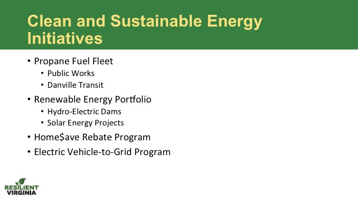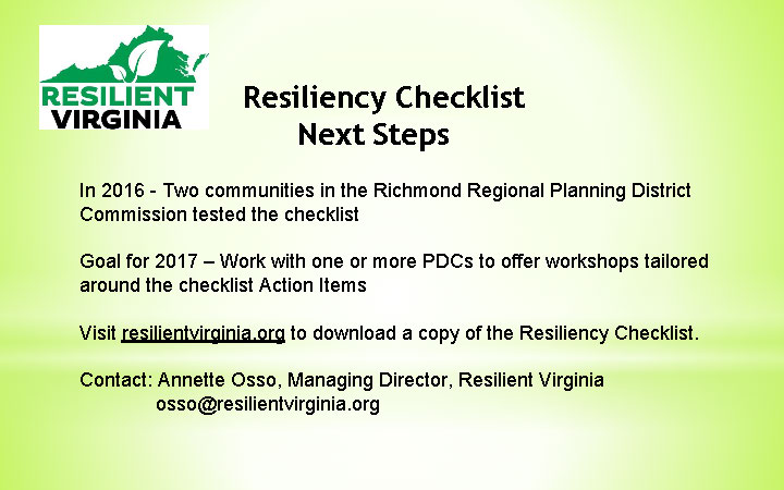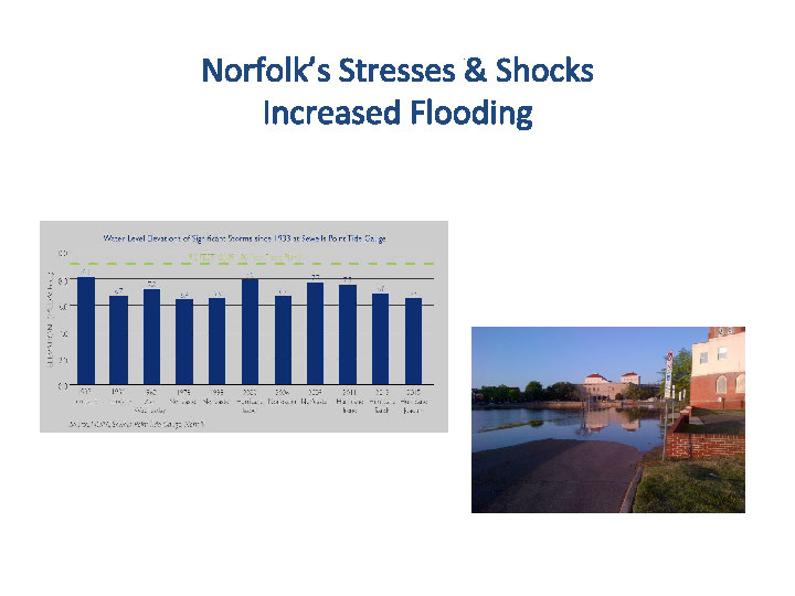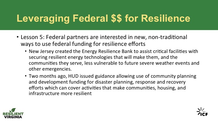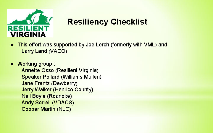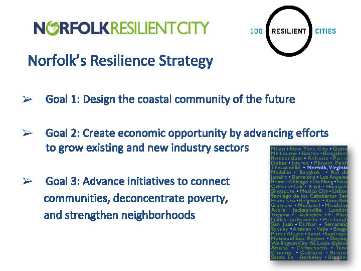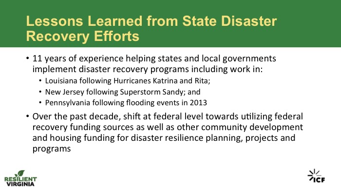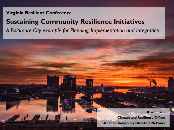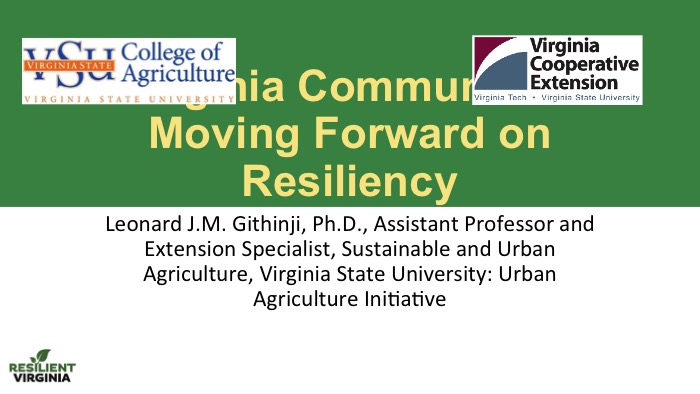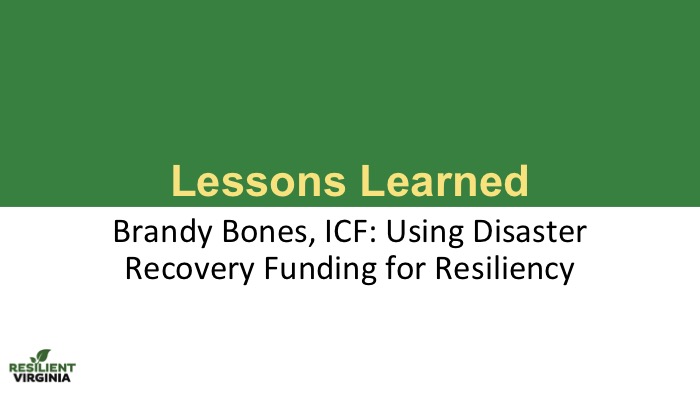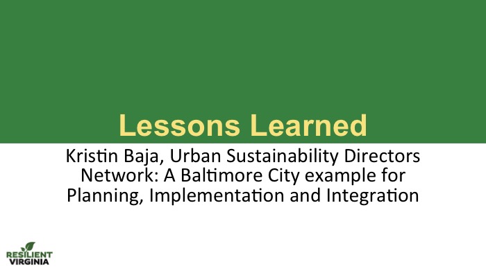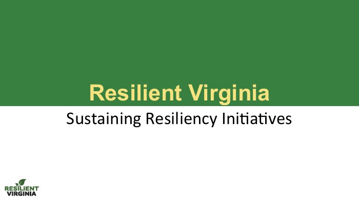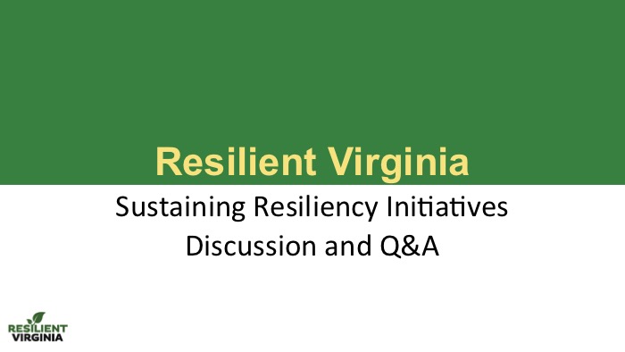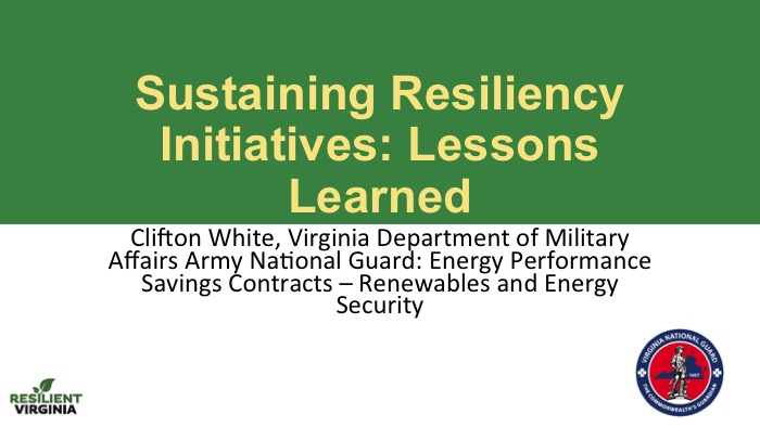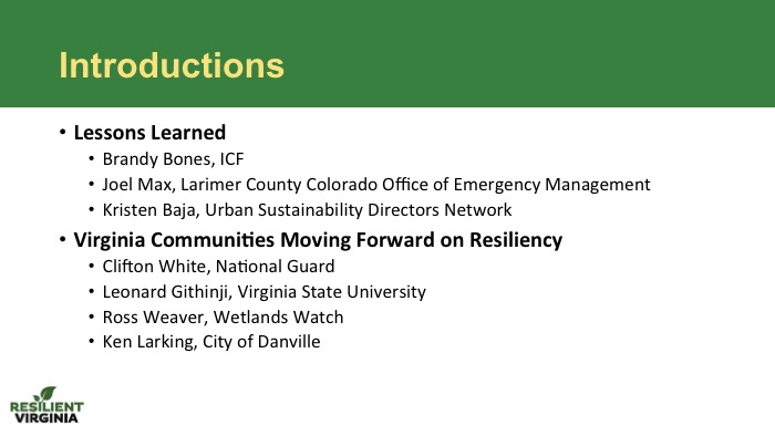 Sustaining Resiliency Initiatives Facilitator: Brandy Bones, AICP, PMP, MBA, Senior Manager, ICF International Lessons Learned from Around the Country Louisiana and New Jersey: Lessons Learned in Disaster, Recovery and Resiliency: Brandy Bones, AICP, PMP, MBA, Senior Manager, ICF International Colorado Lessons Learned: Joel Max, Emergency Management Coordinator, Larimer County, CO Challenges for Baltimore’s Resiliency Plans: Kristin Baja, National Resilience Officer, USDN Resiliency Next Steps in Virginia Communities Resiliency Initiatives in the Virginia National Guard: Clifton White, CSM, Assistant CFMO, Virginia National Guard Urban Agriculture Initiative: Leonard Githinji, Ph.D., Assistant Professor, Sustainable and Urban Agriculture, Virginia State University Tools for Sea Level Rise in Coastal Neighborhoods: Ross Weaver, Program Assistant Director, Wetlands Watch Danville Moves Ahead with Clean Power: Ken Larking, City Manager, Danville VA