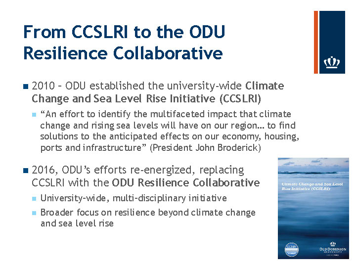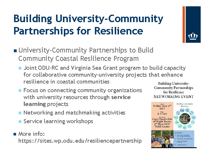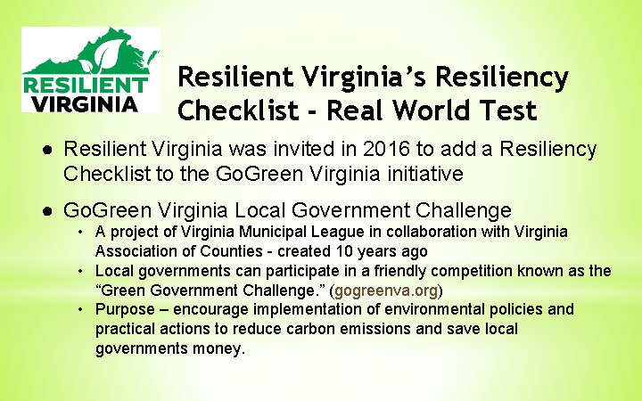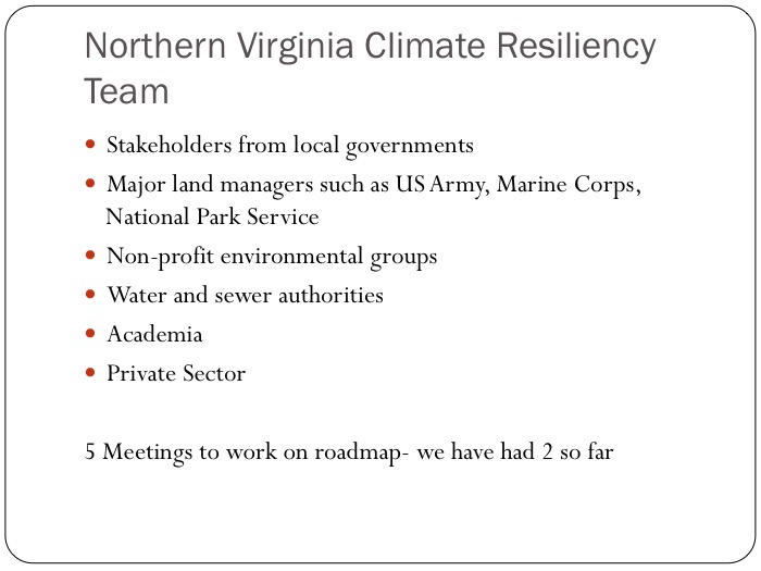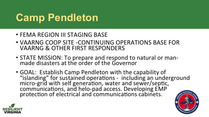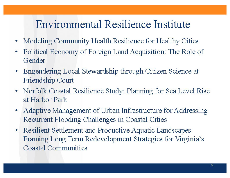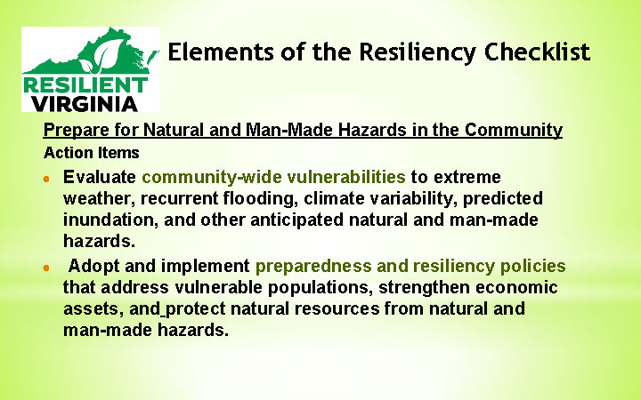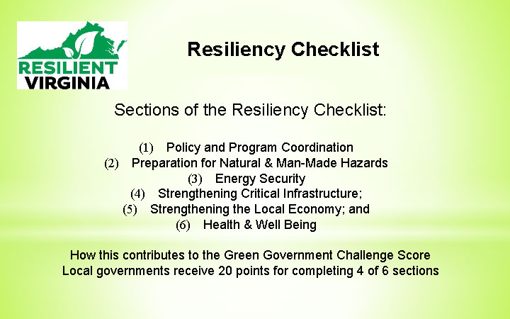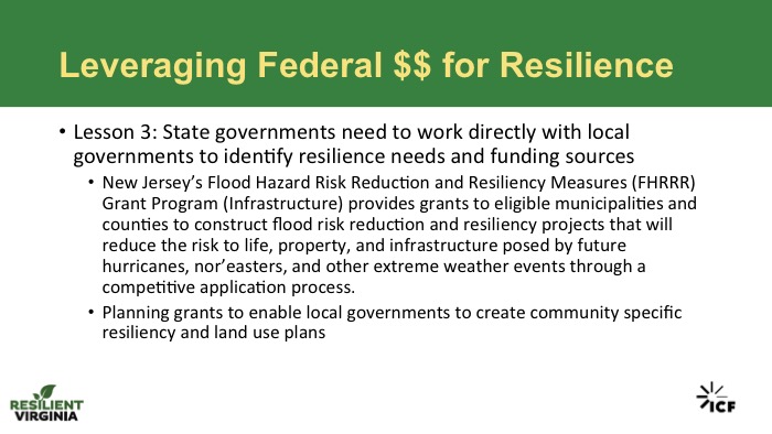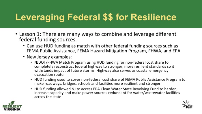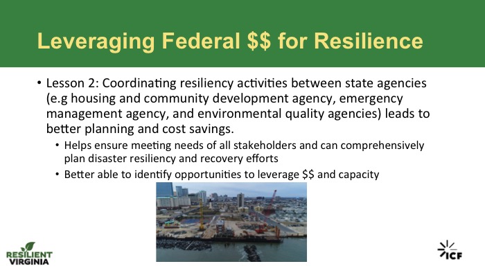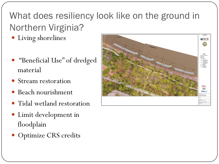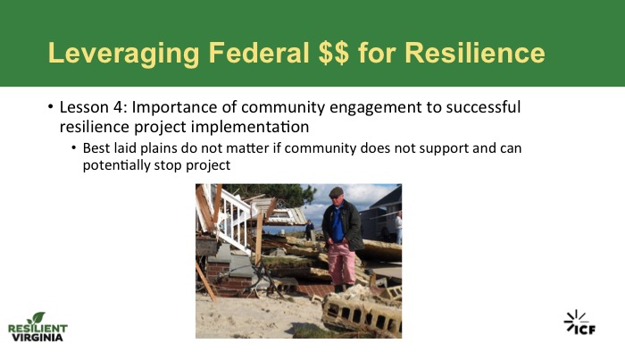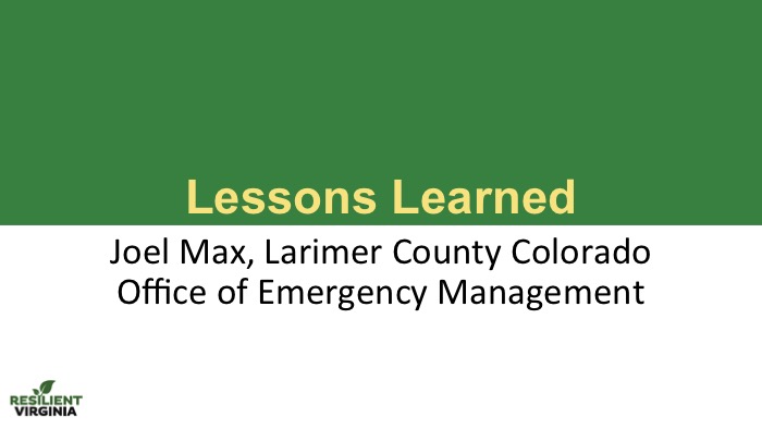 Sustaining Resiliency Initiatives Facilitator: Brandy Bones, AICP, PMP, MBA, Senior Manager, ICF International Lessons Learned from Around the Country Louisiana and New Jersey: Lessons Learned in Disaster, Recovery and Resiliency: Brandy Bones, AICP, PMP, MBA, Senior Manager, ICF International Colorado Lessons Learned: Joel Max, Emergency Management Coordinator, Larimer County, CO Challenges for Baltimore’s Resiliency Plans: Kristin Baja, National Resilience Officer, USDN Resiliency Next Steps in Virginia Communities Resiliency Initiatives in the Virginia National Guard: Clifton White, CSM, Assistant CFMO, Virginia National Guard Urban Agriculture Initiative: Leonard Githinji, Ph.D., Assistant Professor, Sustainable and Urban Agriculture, Virginia State University Tools for Sea Level Rise in Coastal Neighborhoods: Ross Weaver, Program Assistant Director, Wetlands Watch Danville Moves Ahead with Clean Power: Ken Larking, City Manager, Danville VA