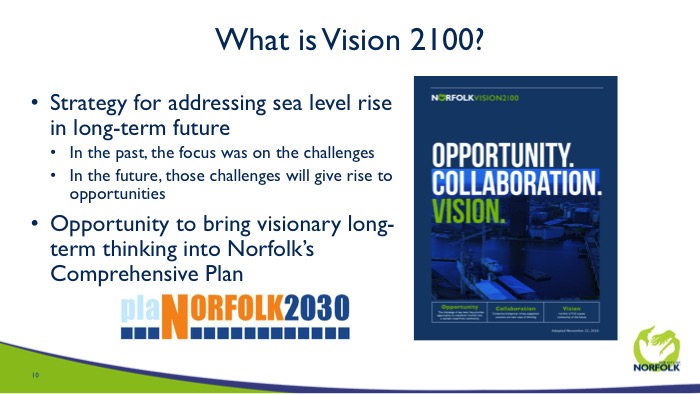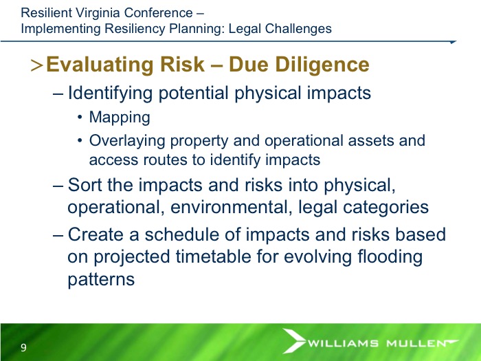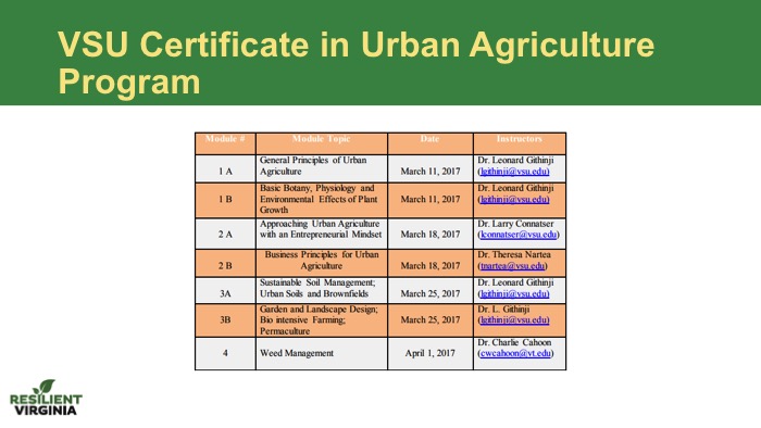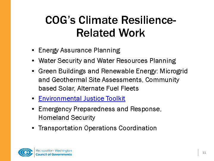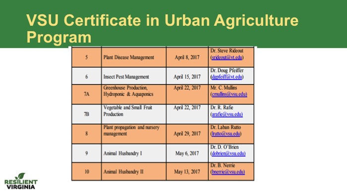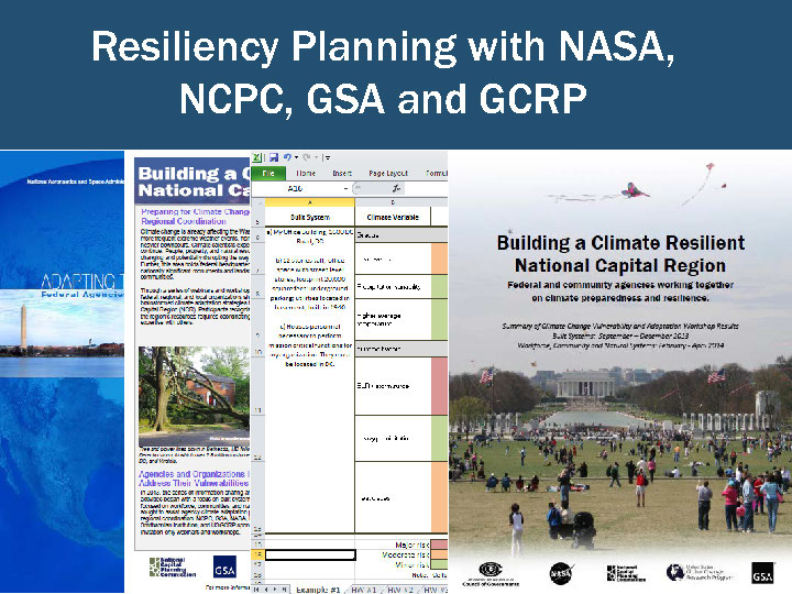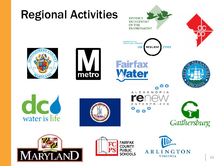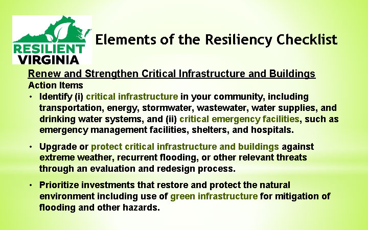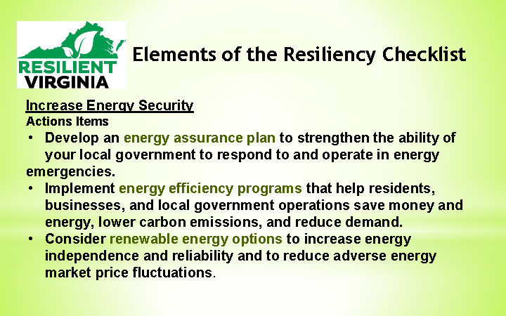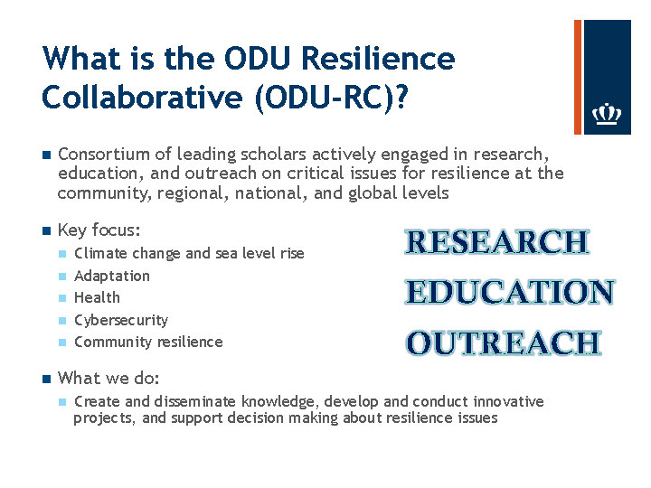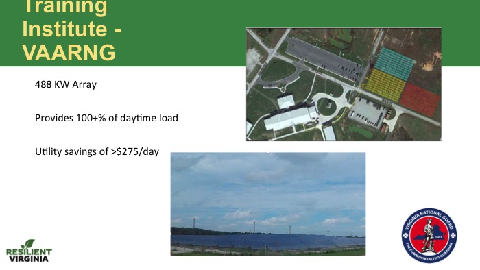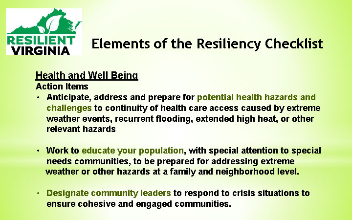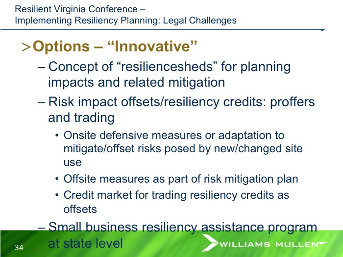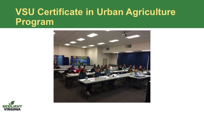 Sustaining Resiliency Initiatives Facilitator: Brandy Bones, AICP, PMP, MBA, Senior Manager, ICF International Lessons Learned from Around the Country Louisiana and New Jersey: Lessons Learned in Disaster, Recovery and Resiliency: Brandy Bones, AICP, PMP, MBA, Senior Manager, ICF International Colorado Lessons Learned: Joel Max, Emergency Management Coordinator, Larimer County, CO Challenges for Baltimore’s Resiliency Plans: Kristin Baja, National Resilience Officer, USDN Resiliency Next Steps in Virginia Communities Resiliency Initiatives in the Virginia National Guard: Clifton White, CSM, Assistant CFMO, Virginia National Guard Urban Agriculture Initiative: Leonard Githinji, Ph.D., Assistant Professor, Sustainable and Urban Agriculture, Virginia State University Tools for Sea Level Rise in Coastal Neighborhoods: Ross Weaver, Program Assistant Director, Wetlands Watch Danville Moves Ahead with Clean Power: Ken Larking, City Manager, Danville VA
