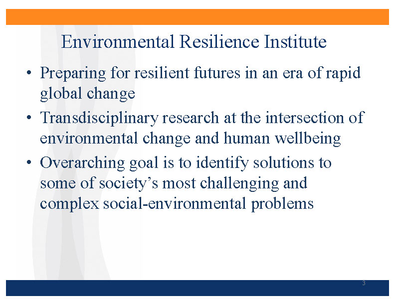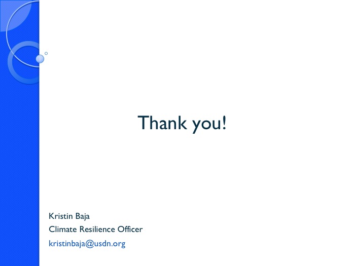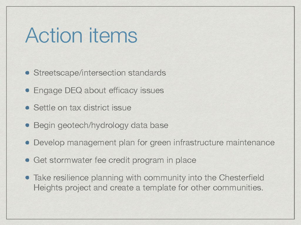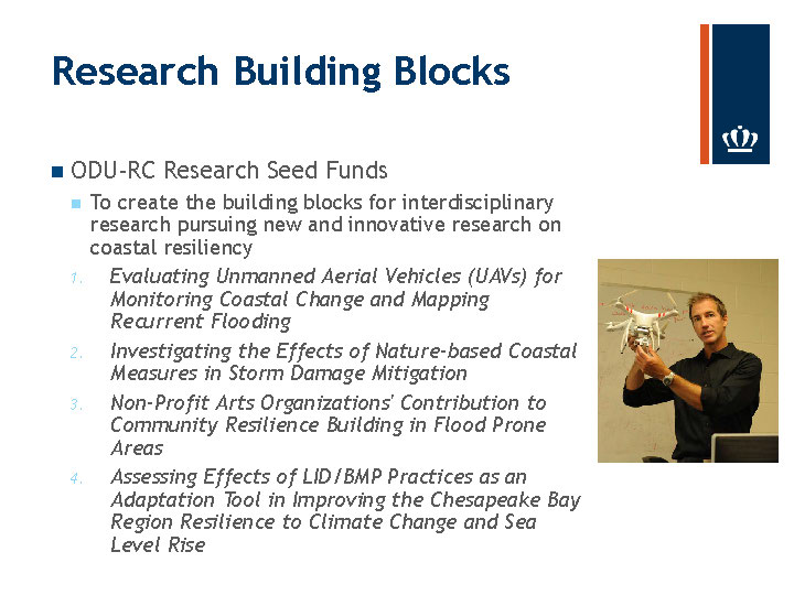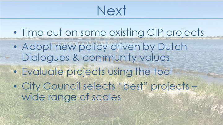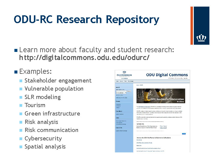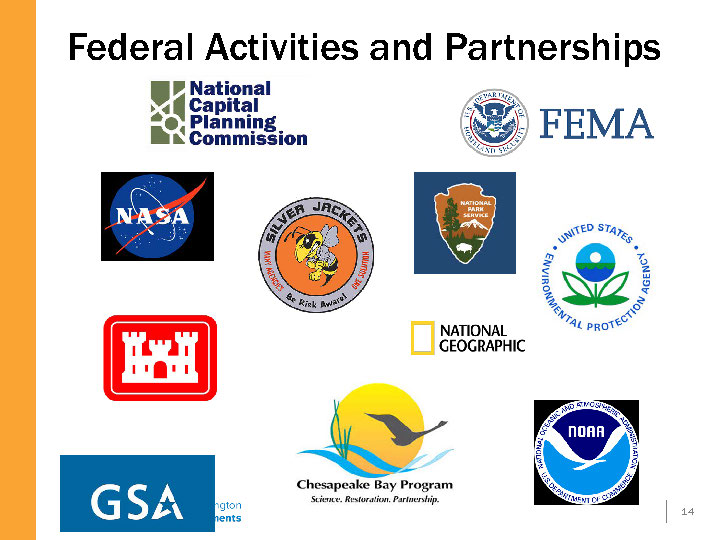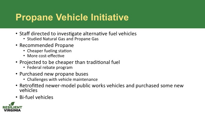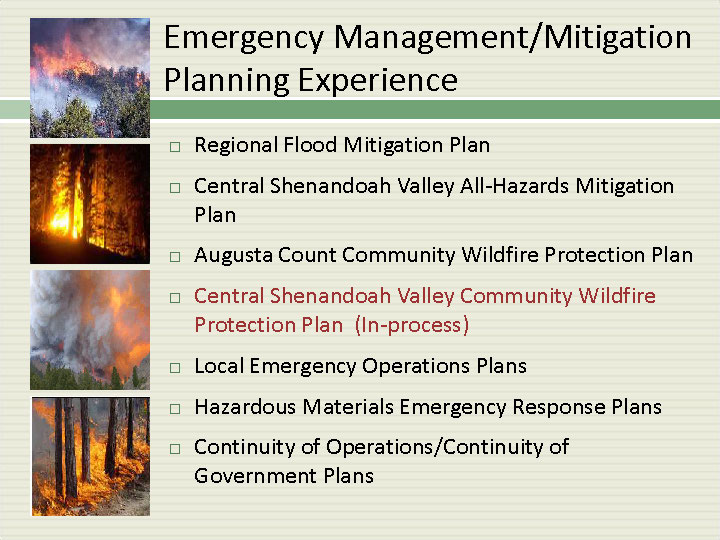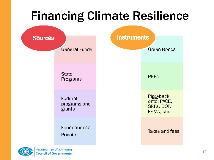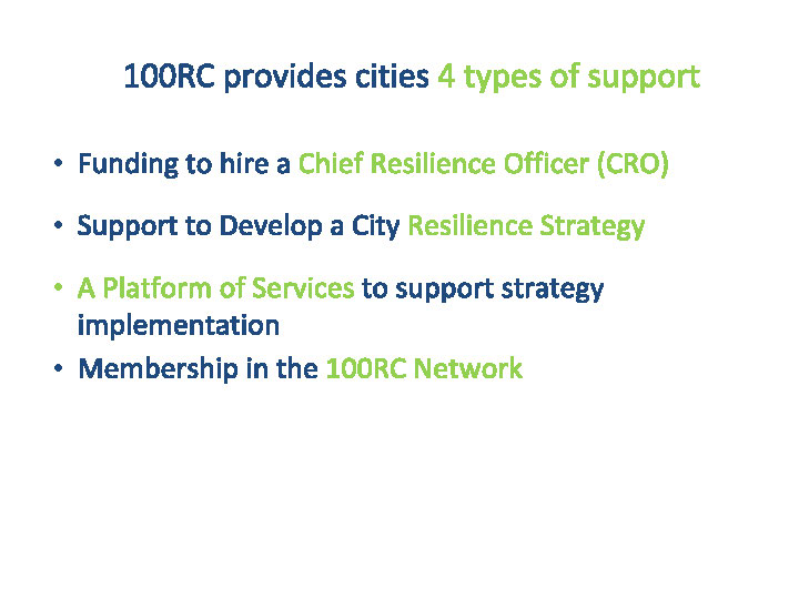 Sustaining Resiliency Initiatives Facilitator: Brandy Bones, AICP, PMP, MBA, Senior Manager, ICF International Lessons Learned from Around the Country Louisiana and New Jersey: Lessons Learned in Disaster, Recovery and Resiliency: Brandy Bones, AICP, PMP, MBA, Senior Manager, ICF International Colorado Lessons Learned: Joel Max, Emergency Management Coordinator, Larimer County, CO Challenges for Baltimore’s Resiliency Plans: Kristin Baja, National Resilience Officer, USDN Resiliency Next Steps in Virginia Communities Resiliency Initiatives in the Virginia National Guard: Clifton White, CSM, Assistant CFMO, Virginia National Guard Urban Agriculture Initiative: Leonard Githinji, Ph.D., Assistant Professor, Sustainable and Urban Agriculture, Virginia State University Tools for Sea Level Rise in Coastal Neighborhoods: Ross Weaver, Program Assistant Director, Wetlands Watch Danville Moves Ahead with Clean Power: Ken Larking, City Manager, Danville VA