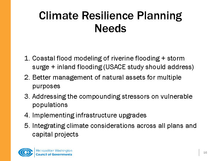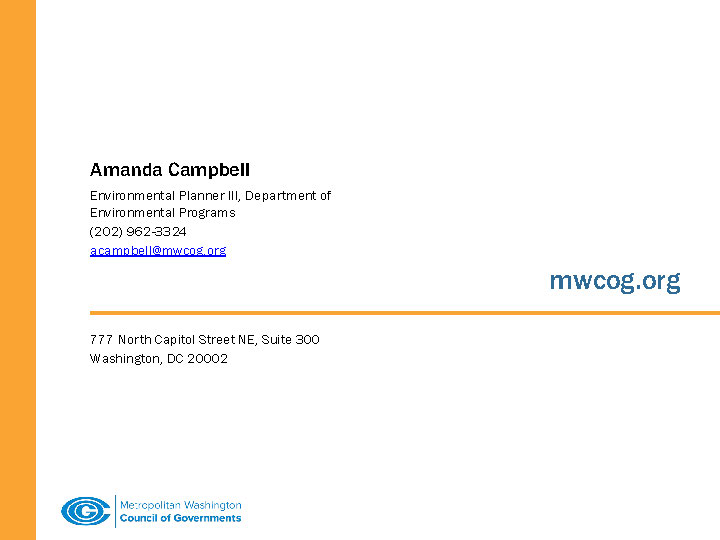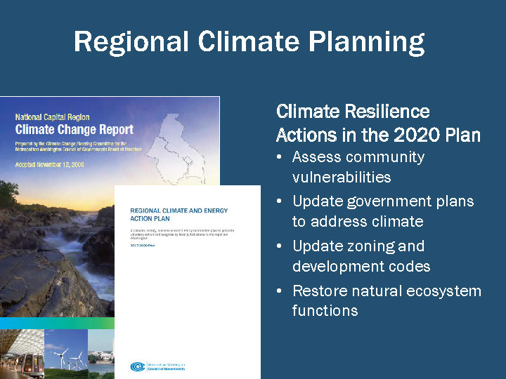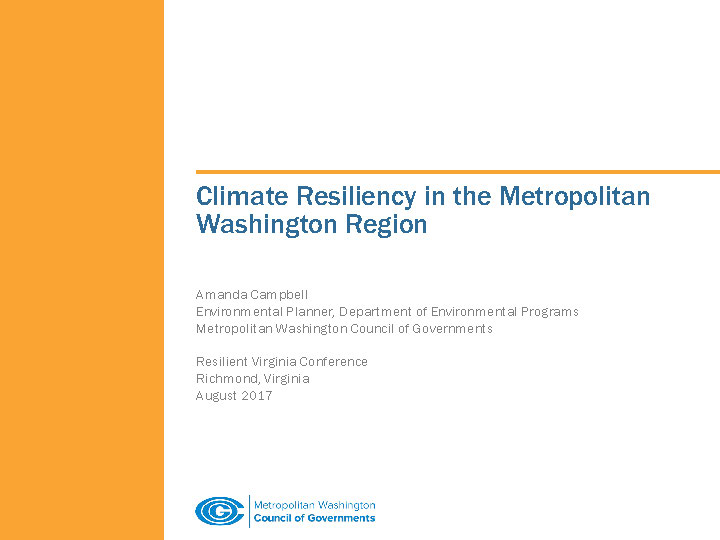 3:45–4:00 PM BREAK WITH EXHIBITORS4:00–5:30 PM BREAKOUT SESSION THREE: RESILIENCY CASE STUDIESUrban Focus Moderator: Kathryn Miller, Climate Resilience Expert Amanda Campbell, Environmental Planner III, MWCOG: Resiliency and Climate Adaptation Plans in the National Capital Region Corey Miles, Senior Environmental Planner, NVRC: Developing a Regional Resiliency Plan in Northern Virginia Joel Max, Emergency Management Coordinator, Larimer County, CO: The Fort Collins Regional Resiliency Assessment Project Joan Kelsch, LEED AP, Arlington Green Buildings Program Manager: Energy Resilience and Net Zero Schools in Arlington