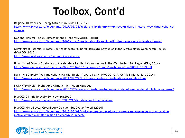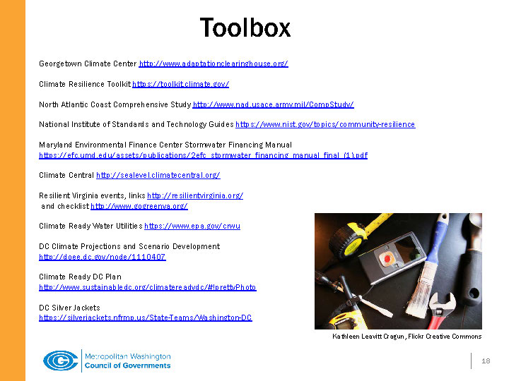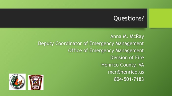 Tools, Technology, & Tactics Moderator: Kathy Robins, Senior Emergency Management Planner, RRPDC Christina Luman-Bailey, Vice-Mayor Ward 1, Hopewell, and Annette Osso, Managing Director, Resilient Virginia: VML/VACO GoGreen Resiliency Guide Danielle Progen, Region 5 All Hazards Planner, VDEM: FEMA’s Flood Risk MAP Tools Jeremy Hoffman, Ph.D., Climate & Earth Science Specialist, Science Museum of Virginia: Assessing Richmond’s Heat Island Using Cars, Bikes, and Citizen Science Thomas Gagnon, Statewide Interoperability Coordinator for the Secretary of Public Safety and Homeland Security: A Public Safety Broadband Network for Virginia