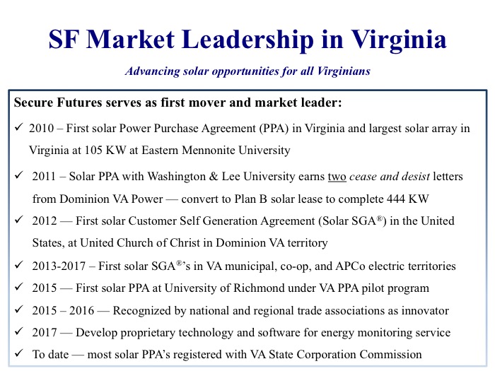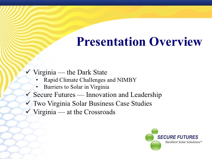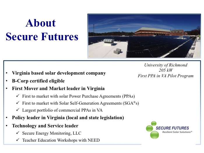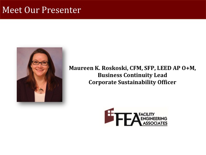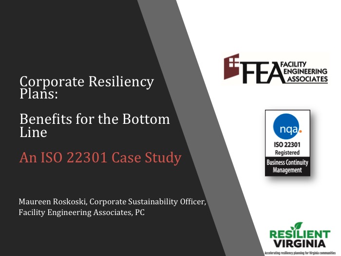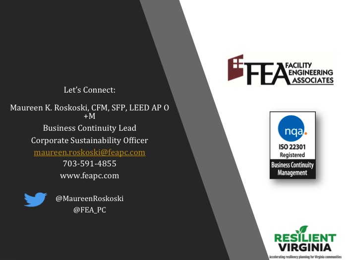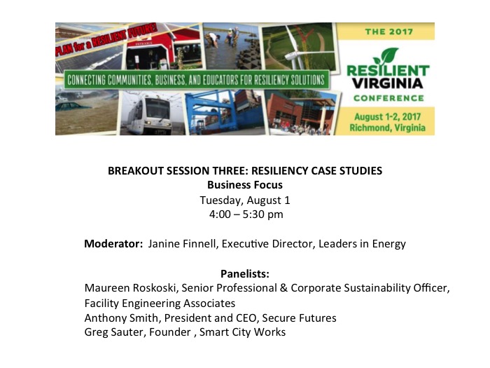 Business Focus Moderator: Janine Finnell, Executive Director and Clean Energy Ambassador, Leaders in Energy Maureen Roskoski, CFM, SFP, LEED AP O+M, Senior Professional & Corporate Sustainability Officer, Facility Engineering Associates: Corporate Resiliency Plans: Benefits for the Bottom Line Anthony Smith, President and CEO, Secure Futures: Solar Service Agreements: Two Case Studies in Virginia Gregory Sauter, P.E., M.ASCE, Founder, Smart City Works: Business Actuator for Resilient Cities