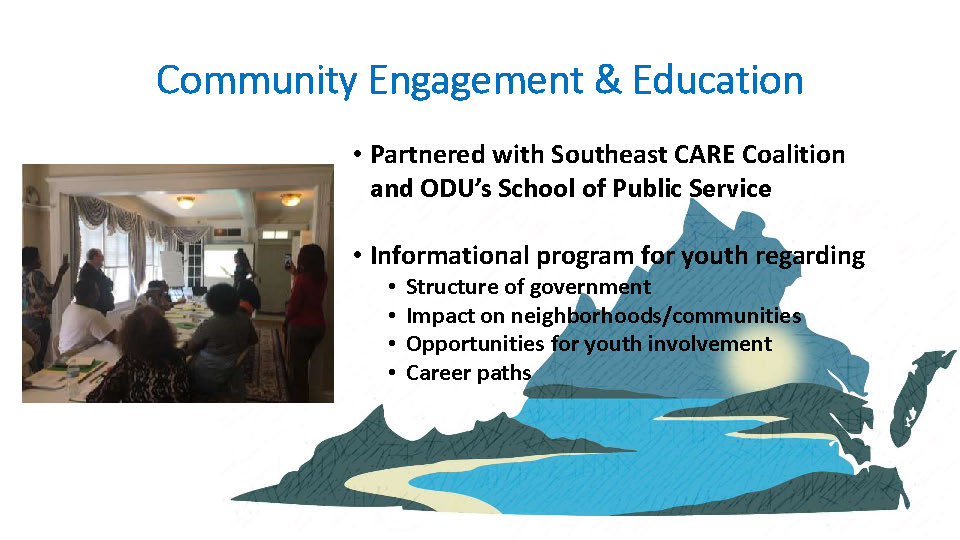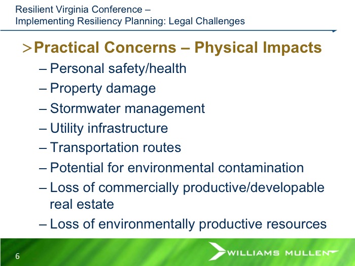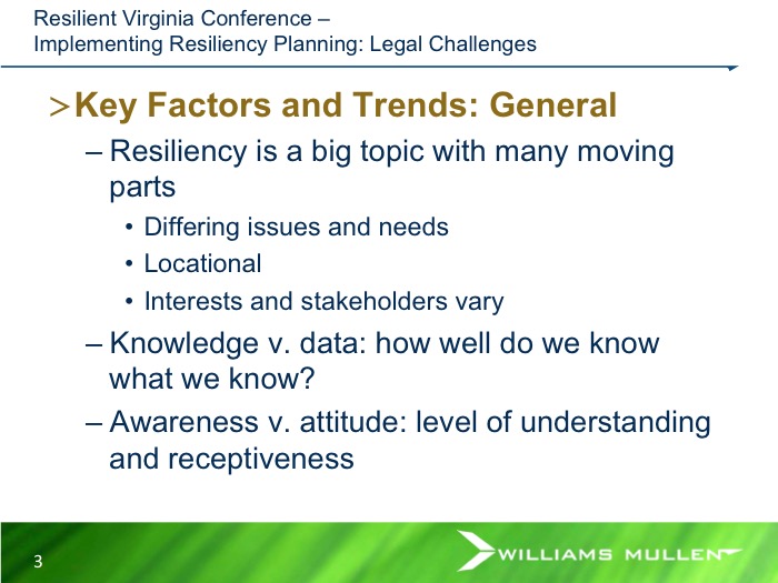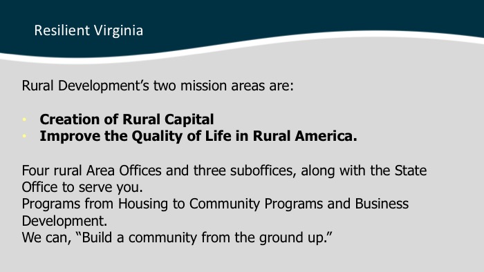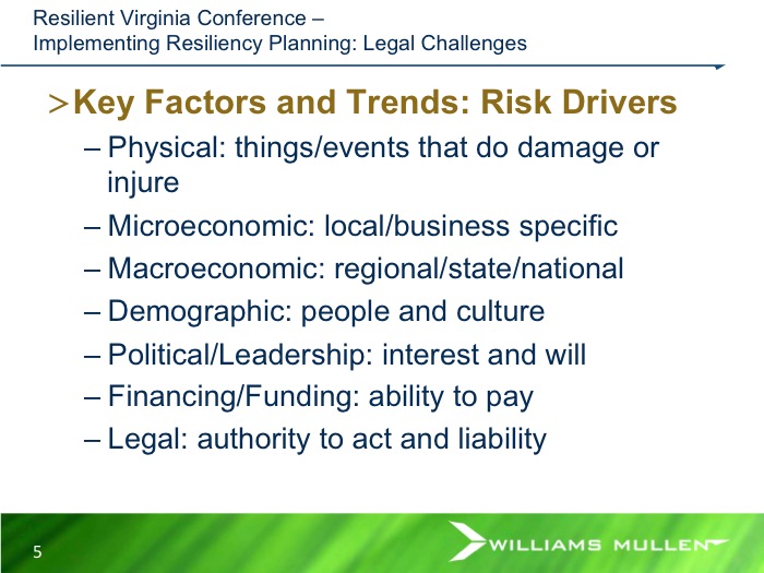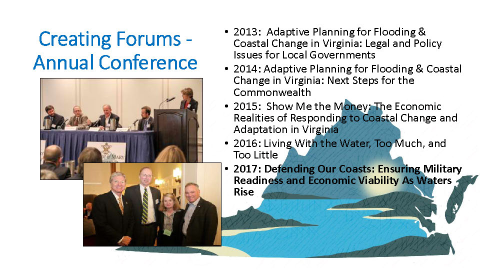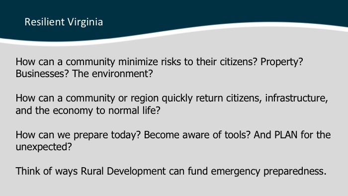 The Resilient Virginia Conference brings together participants from local and national businesses, and representatives from higher education, state and local governments, and community organizations to: