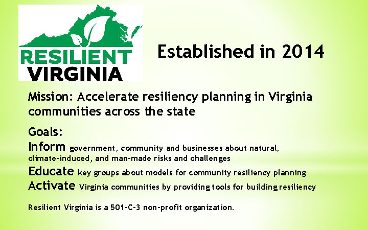 For sponsor and exhibitor information details, contact Annette Osso, Managing Director, Resilient Virginia (osso@ResilientVirginia.org).