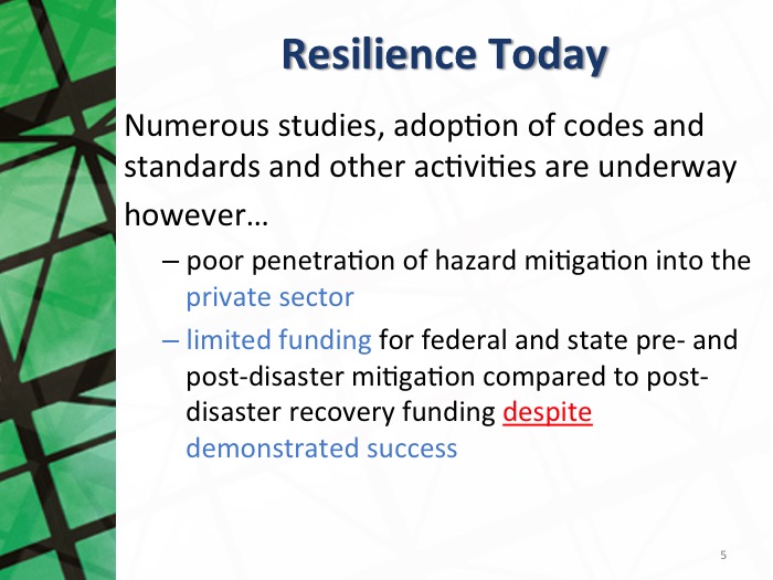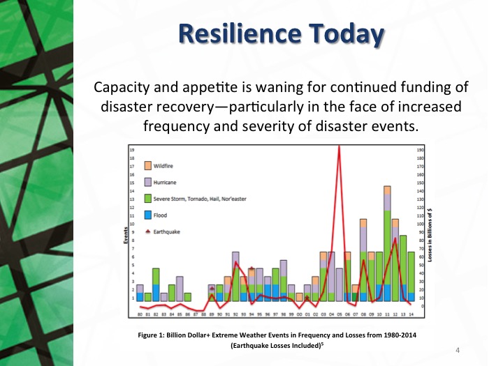 Breakout sessions will provide the opportunity for in-depth presentations on critical aspects of resiliency as it relates to challenges and risks faced by communities that range from extreme weather events and national security and public health issues to social and economic disruptions.