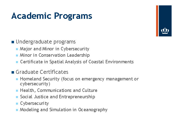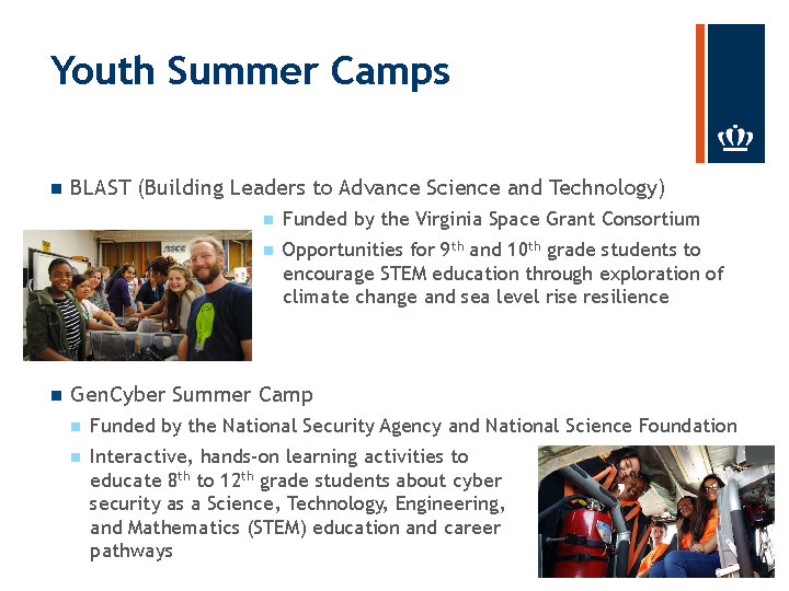 Moving Towards Energy Security Moderator: Angela Navarro, Virginia Deputy Secretary of Natural Resources Eduardo Alcorta, Senior Business Development Leader, Distributed Power, GE Power: Microgrid Systems’ Role in Resiliency Aaron Sutch, Program Director, VA SUN: Small Scale Distributed Solar Karen Schaufeld, Founder, Powered by Facts: Large Scale Private Solar Dianne Corsello, Director of Business Development, Dominion Energy: Utility-Scale Solar Educators Focused on Solutions Moderator: James Keck, Assistant Professor, Homeland Security, Virginia Commonwealth University Christie Jones, M.S., Education Program Manager, Center for Infrastructure Protection and Homeland Security, George Mason University Wie Yusuf, Ph.D., Chair, Resilience Collaborative Steering Committee, Old Dominion University Angela King, Assistant Director, Virginia Coastal Policy Center, William and Mary Angela Orebaugh, Ph.D., Director of Cybersecurity and IT Program, University of Virginia