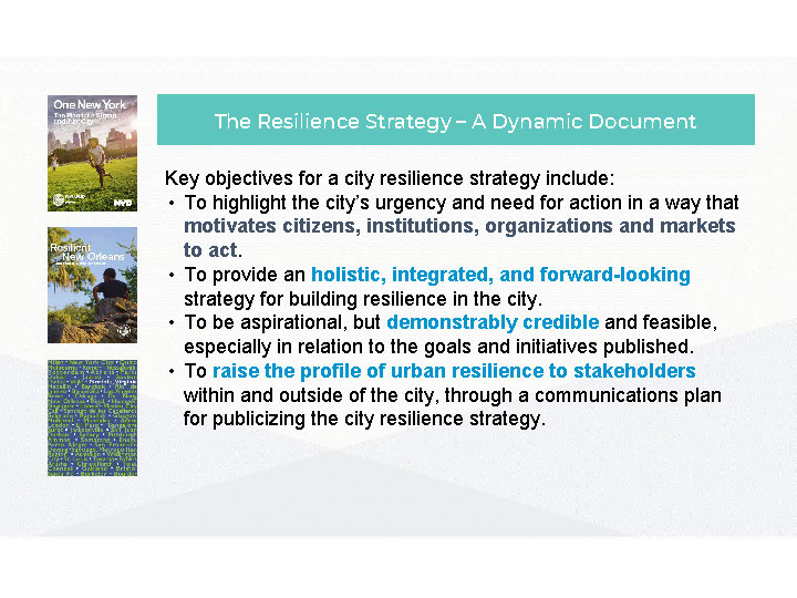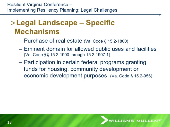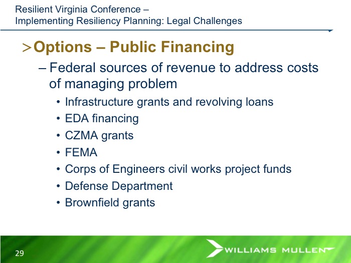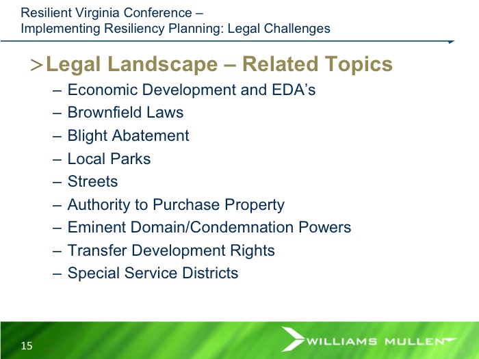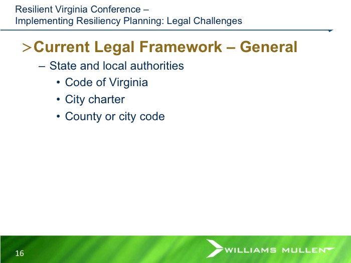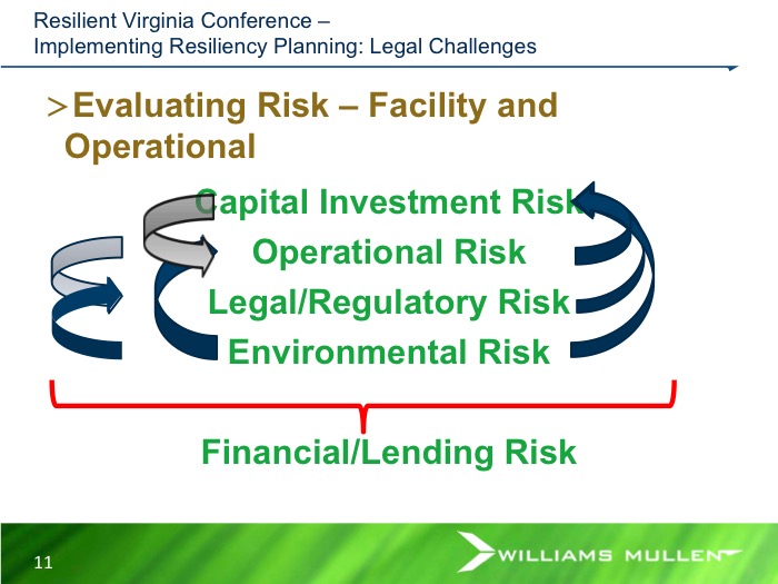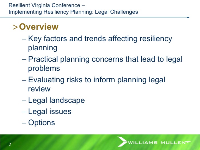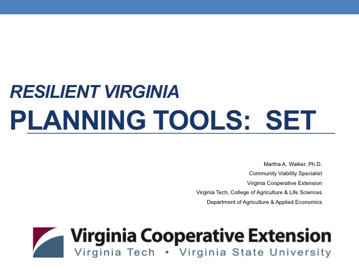 In this workshop you will: -Complete learning activities -Engage in group discussion -Develop a plan framework -Review helpful resources We will communicate the steps involved in developing a community resilience plan using the NIST Community Resilience Planning Guide as a framework. Attendees will learn how to form a team, involve stakeholders, identify community hazards, and develop strategy, all in effort to develop their own community resilience plan. The workshop includes individual and group learning activities, as well as interactive discussions to provide a dynamic experience for attendees. Those attending the session will walk away with a handbook that outlines the framework for their own community resilience plan, including a list of helpful resources and tips. Click here for handbook. Implementing Resiliency Planning Facilitators: Sirirat Tavanopong, LEED AP BD+C, Director, Advance Planning, and David Savarese, Consultant II, Jacobs Introductions and Planning Perspective: David Savarese, Jacobs Legal Challenges: Speaker Pollard, Partner, Williams Mullen Bringing Resiliency into Comprehensive Plans: George Homewood, FAICP, CFM, Director, Norfolk Planning and Community Development Stronger Economies Together: Martha Walker, Community Viability Specialist, Virginia Cooperative Extension Financial Options: Shawn Crumlish, Director of Financial Services, Virginia Resources Authority, and Janice Stroud-Bickes, Acting State Director, USDA-Rural Development Assessing and Updating Risk Data: Anna McRay, Henrico County Deputy Emergency Manager Discussion and Closing: Sirirat Tavanopong, Jacobs