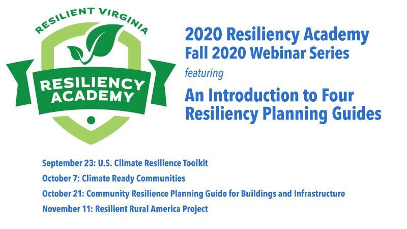 Resilient Virginia’s Fall 2020 Resiliency Academy  featured a series of four webinars highlighting some of the best resiliency planning tools available to help communities build the capacity to maintain critical functionality and vitality in the face of severe disturbances and chronic stressors.