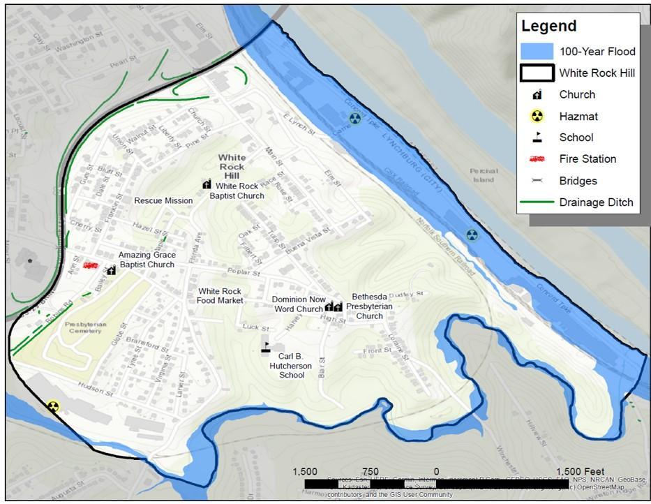 In Lynchburg, flood occurrences, water contamination, and extreme temperature have been identified as current hazards which, due to climate change, will likely be exacerbated. The Lynchburg Rising project, funded by the US Environmental Protection Agency Office of Environmental Justice, engaged historically disinvested neighborhoods in the City, which are disproportionately impacted by these hazards, to better understand their risks and to develop community capacity to address them. This project built on existing sustainability and resilience work being conducted in Lynchburg.