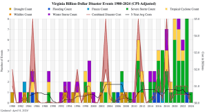 Between 1980 and 2024, Virginia has experienced 107 confirmed weather/climate disaster events with losses exceeding $1 billion each. These major disasters are happening more frequently, with the last 5 years seeing a tripling of annual $1 billion severe events.