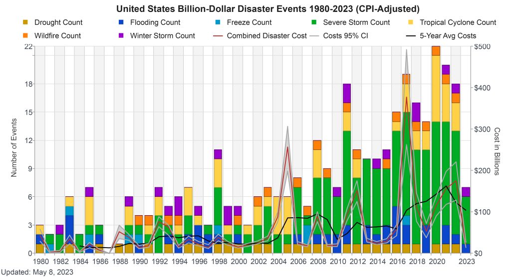In 2022, the US experienced 18 billion-dollar climate disasters that cost a total of $175.2 billion in damages and caused 474 deaths. As these disaster events become more frequent, the economic harm has become more commonplace. Communities have a hard time recovering from a single disaster event let alone multiple events, and the reduction in economic growth can be seen years later.