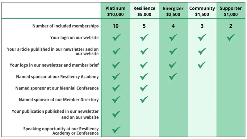 Choose a sponsorship level from the options below. Your company will receive recognition throughout the Fall 2022 Resiliency Academy series as well as additional benefits.